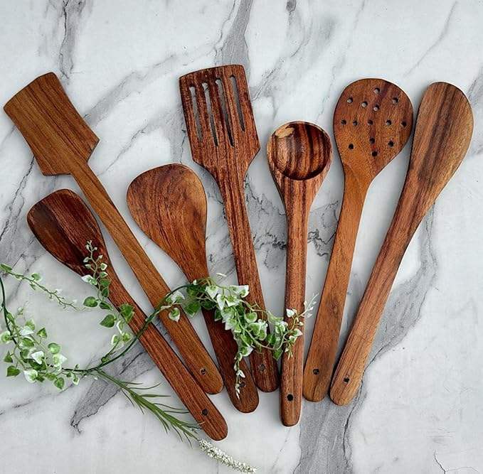 Natural Wooden Spoon And Spatula Set Of 7 Durable Kitchen Utensils For Cooking Serving Stirring & Nonstick Cookware Daily Use