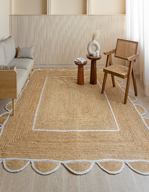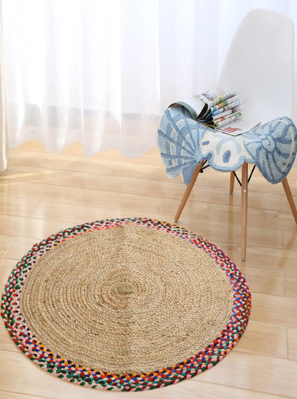 Natural braided jute rug with a fun, colorful circular disc border. Available at wholesale prices.