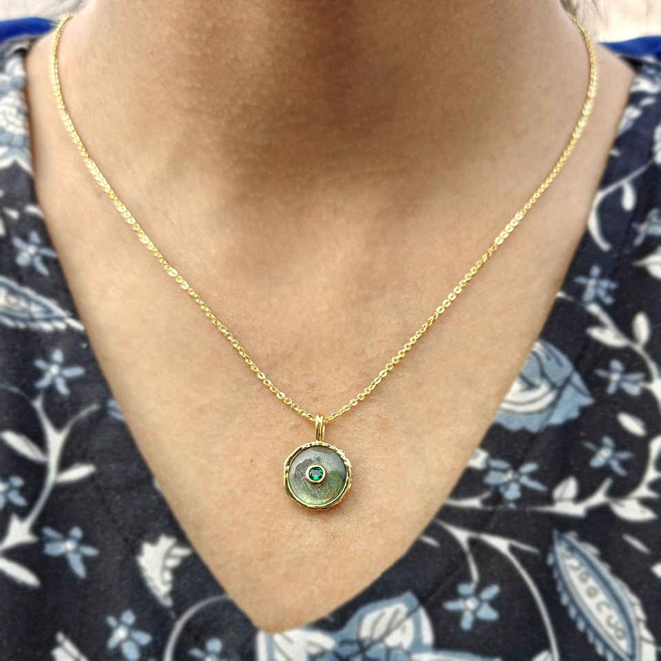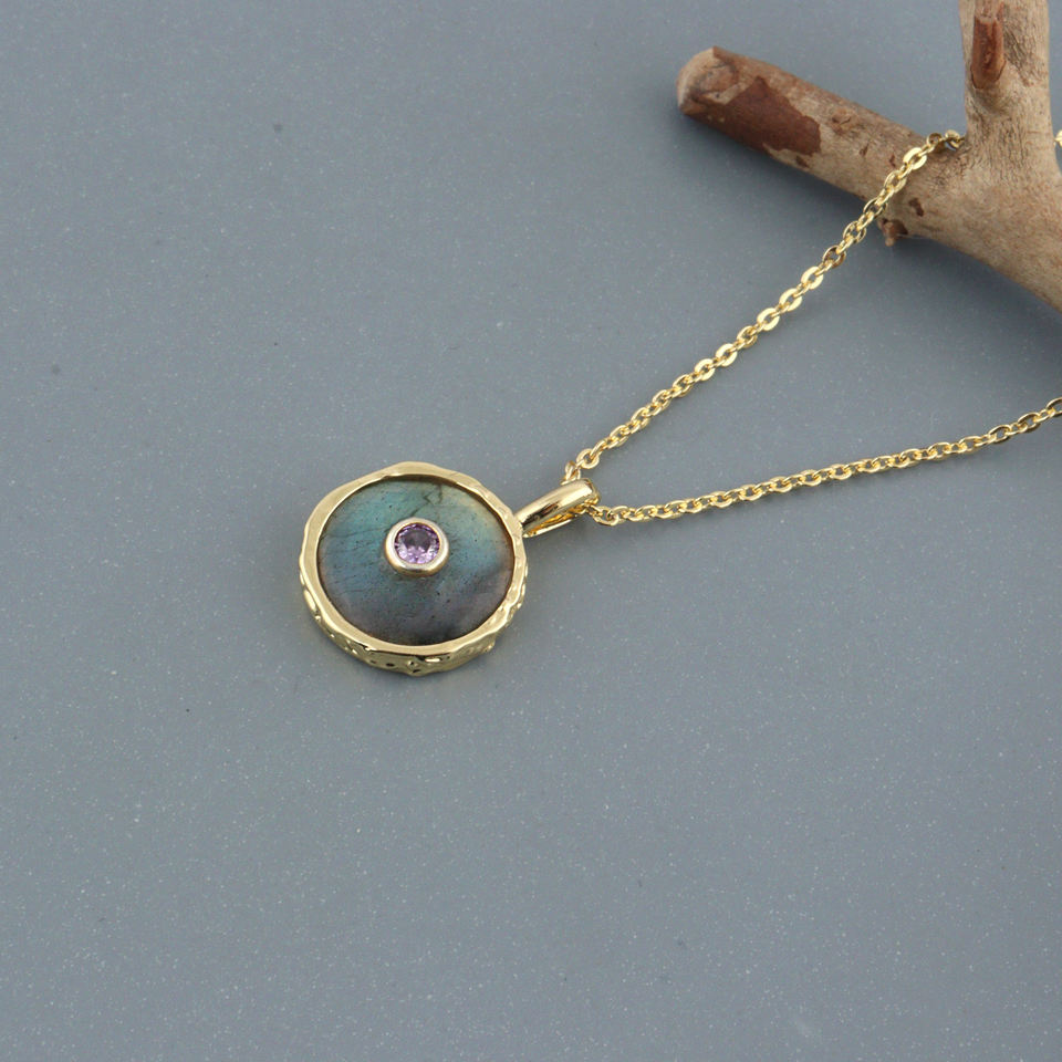 Natural flashy labradorite CZ round mini charm pendant necklace gold plated lightweight layering jewelry for valentine gift