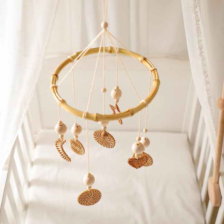 Natural hanging mobiles for kids room decorations best selling rattan baby cot mobiles from factory