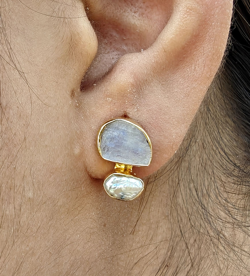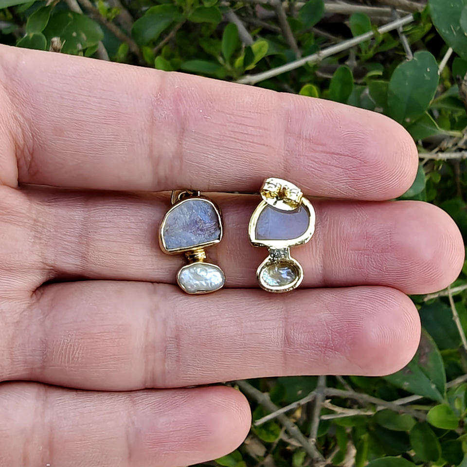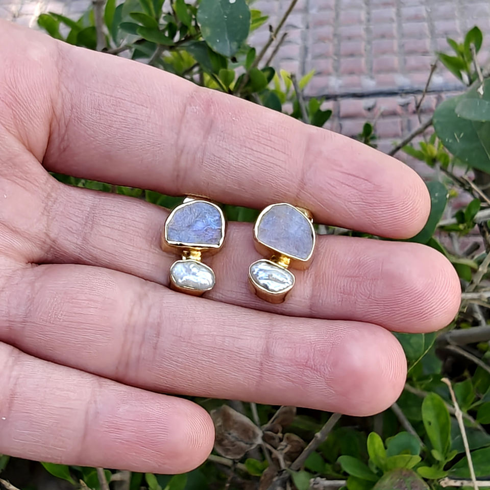 Natural raw look blue fire moonstone with baroque pearl drop stud earring 18k gold plated double stone fashion jewelry earrings