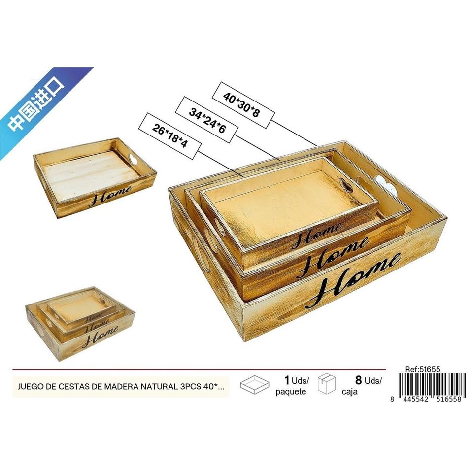 Natural wood basket set with heart-shaped handles, 3 pieces, 40 x 30 x 8 cm - Home decor