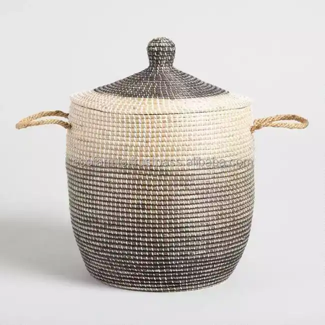 Natural Woven Handmade Boho Style Seagrass Laundry Bins Storage Baskets with Lids and Handles