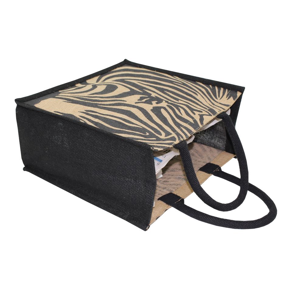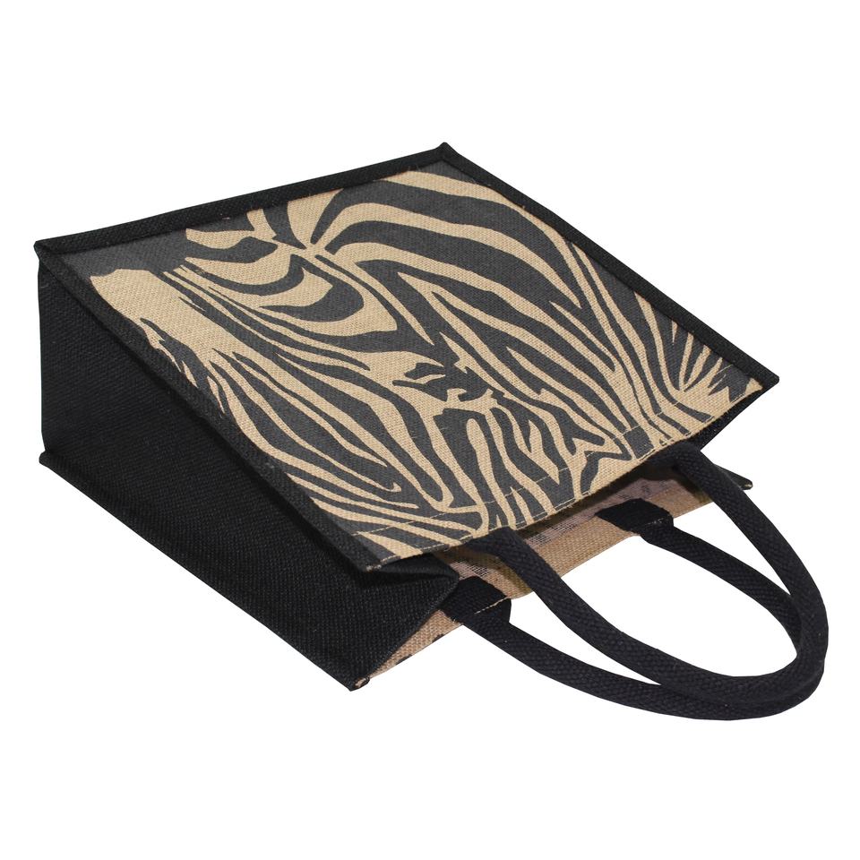 Nature Design Natural Color Jute Tote Bag with Black Sides Zebra Print Padded Rope Handle PP Laminated Animal Print Pattern