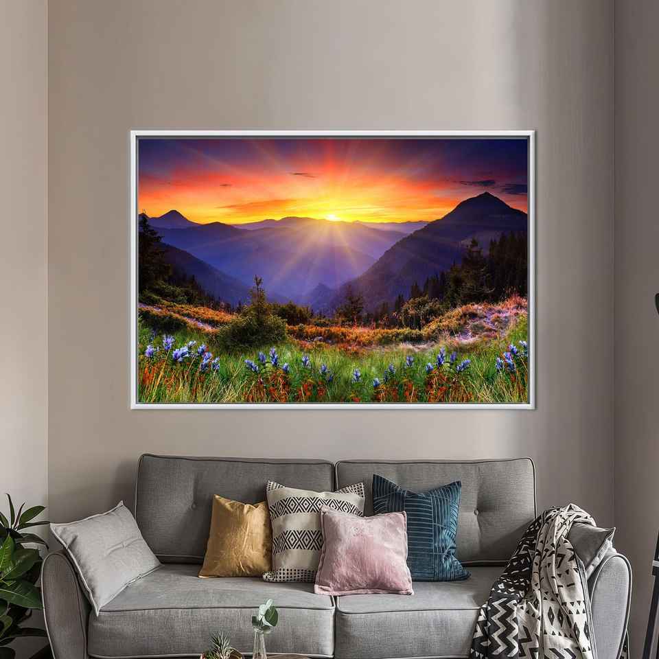 Nature View Art Canvas Print: Elegant Flowers & Mountain Landscape,1P:White Framed