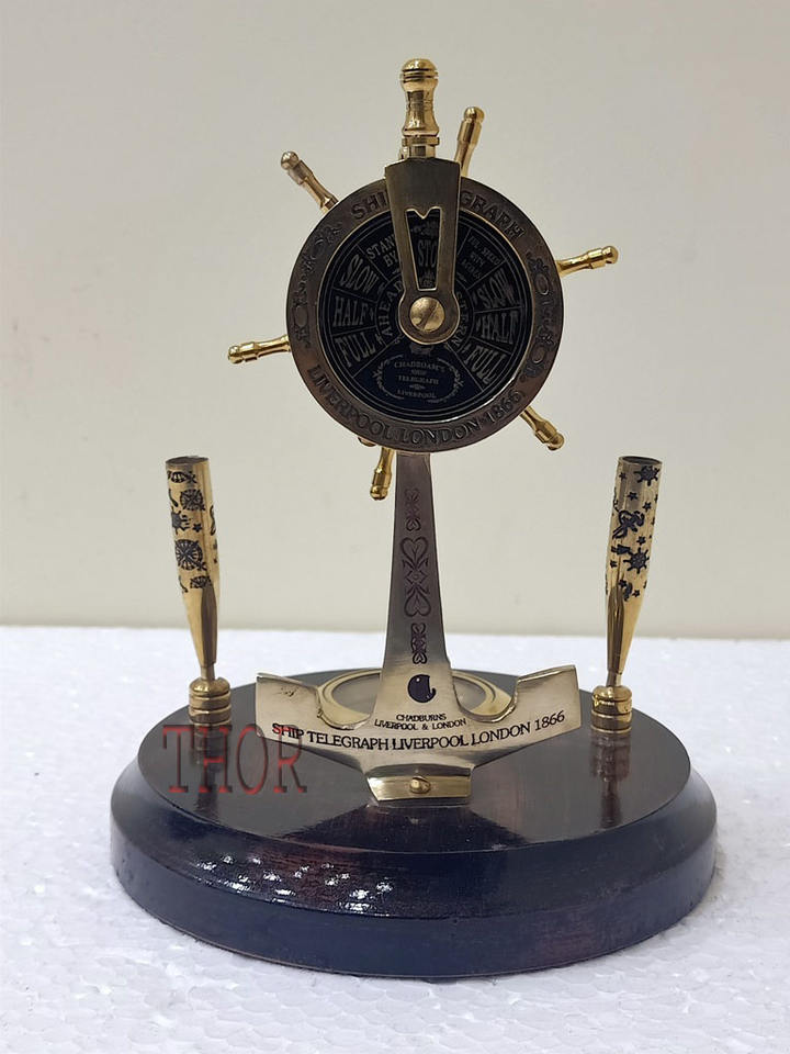 Nautical Brass Telegraph Table Top Clock with Pen Holder Compass on Wooden Base Home/Office Decor