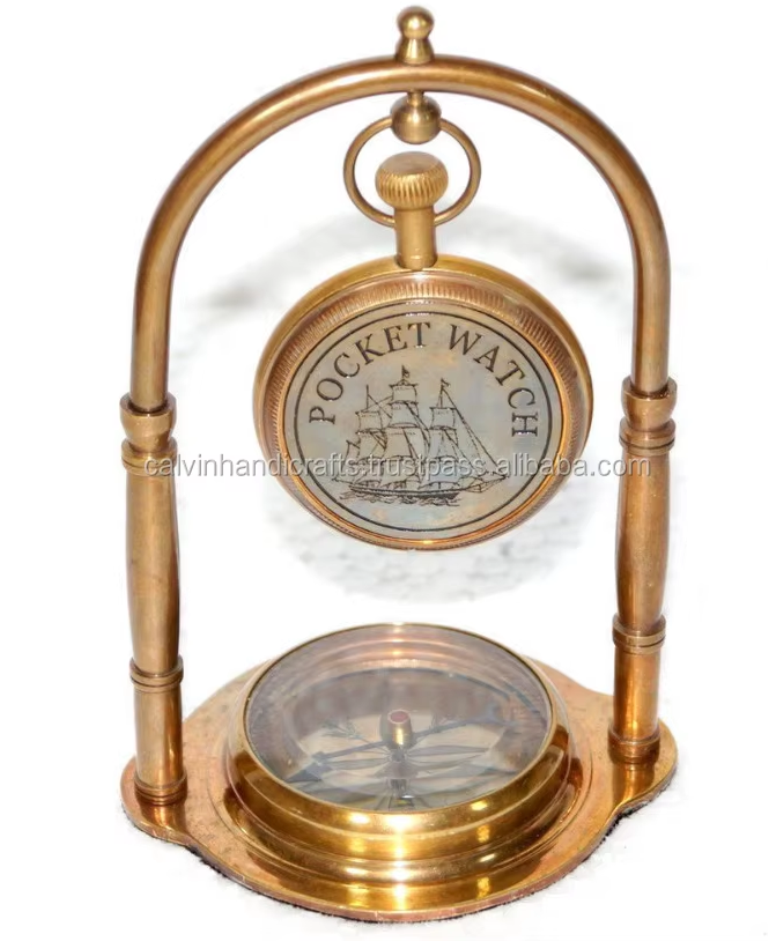Nautical Hanging Solid Brass Vintage Gamble Compass 9\" with Pointer Dial Display Clock and Thermometer on Rosewood Stand