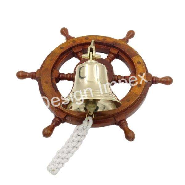 Nautical Wood Ship Wheel Wall Mount Decorative Shinny Polished Brass Nautical Bell White Rope Handle Luxury Bells For Decoration