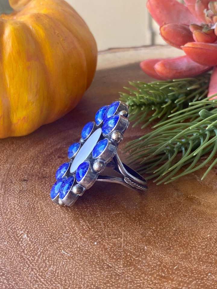 Navajo Lapis and Mother of Pearl Sterling Silver Cluster Ring Handmade Southwestern Jewelry