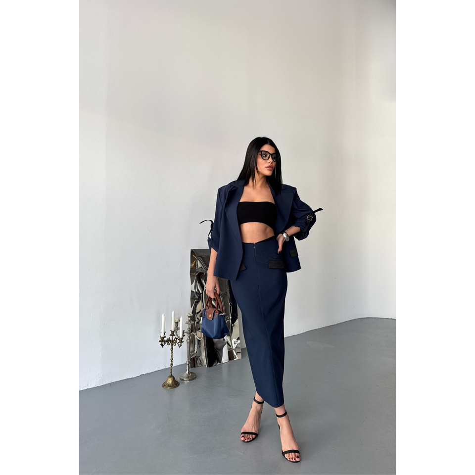 Pearl Button Knitwear Skirt Suit Navy Blue