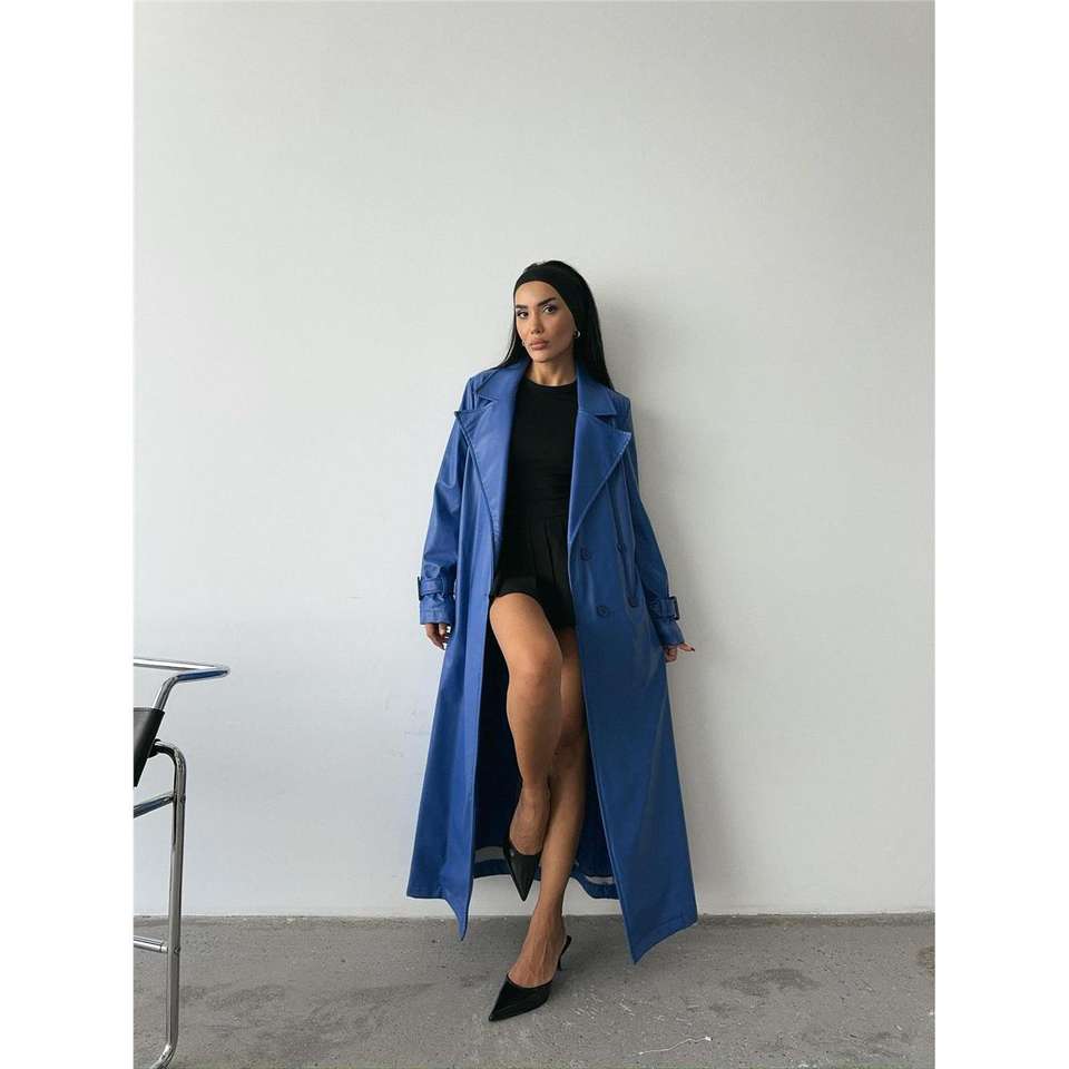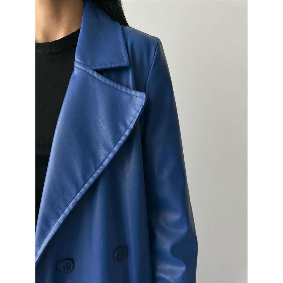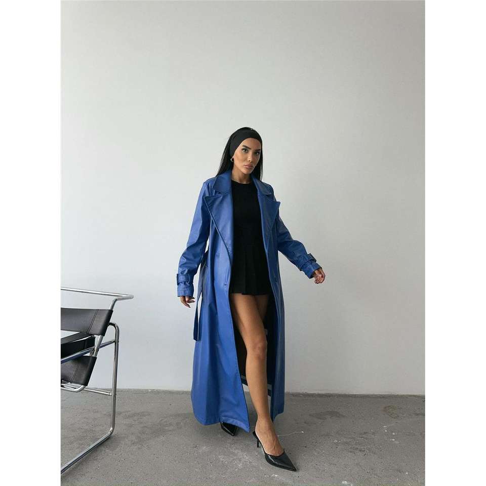 Navy Blue Genuine Leather Trench Coat for Women Long Single-Breasted with Cotton Filling Print Waterproof for Autumn Season