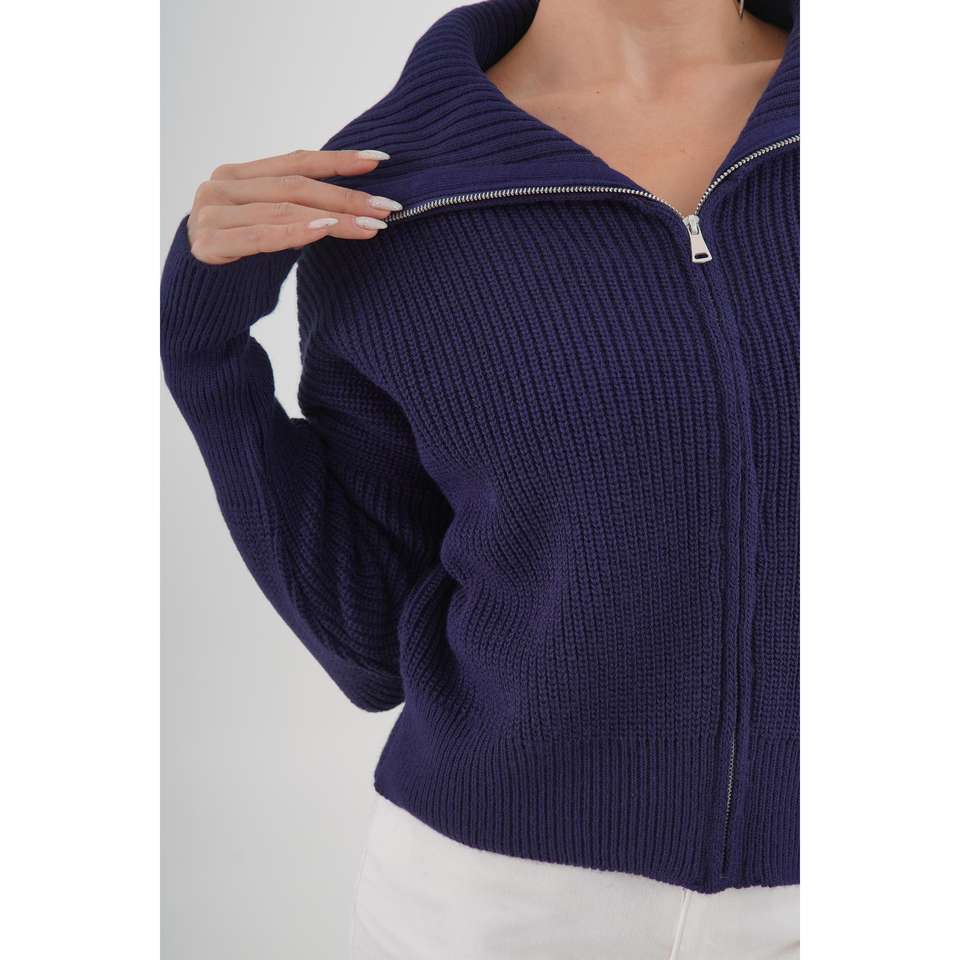 Navy Blue Knitted Cardigan Women Casual Zip-Up Collar Anti-Pilling Long Sleeve Sweater Top