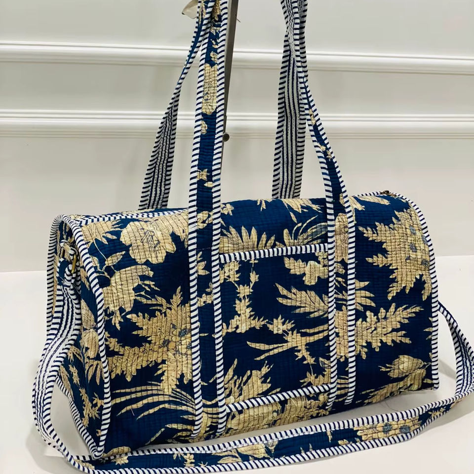 Navy Blue Leaf Printed Cotton Luxury Travel Duffle Bag Large Capacity Weekend Shoulder Handbag with Front Pocket Crossbody Strap