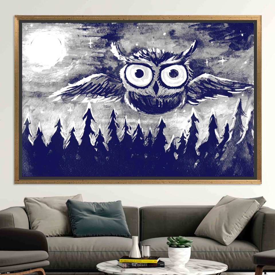 Navy Blue Owl Canvas Art: Pine Tree Landscape, Modern Glass Print,GOLD FRAMED CANVAS