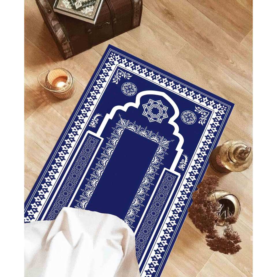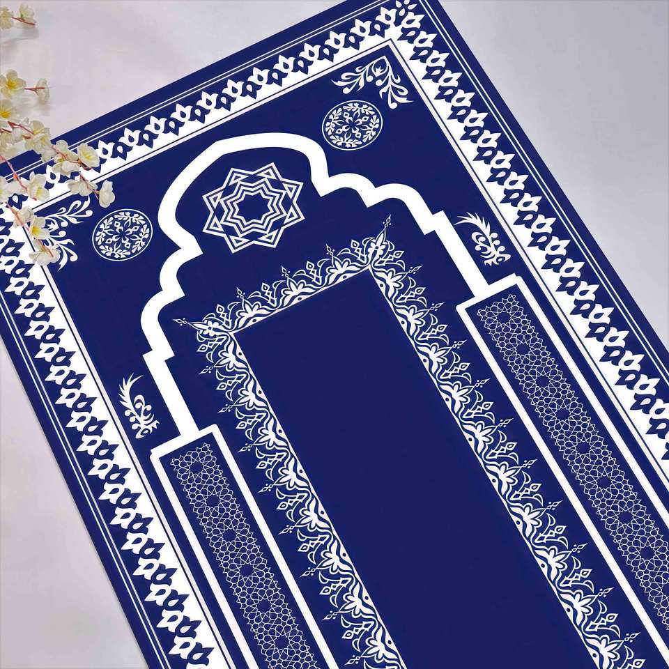 Navy Blue Prayer Rug: Elegant Islamic Design, Printed Rug,With Pile Soft Rug