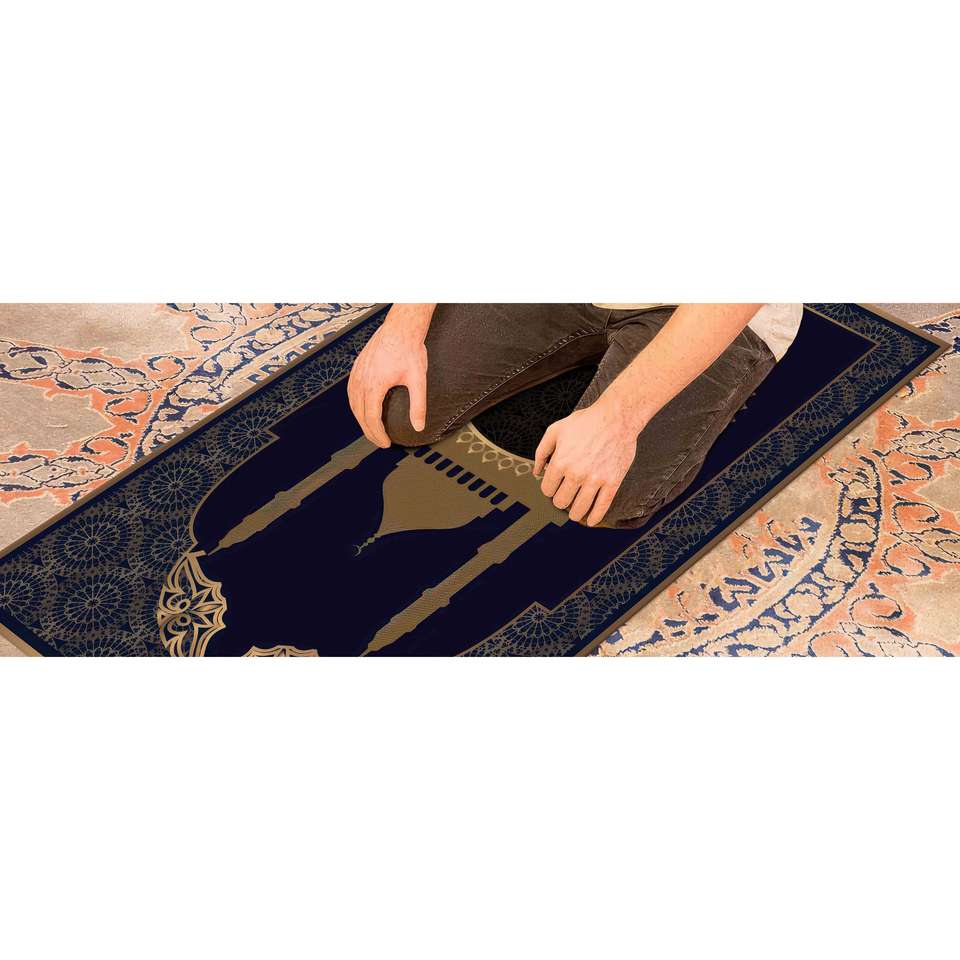 Navy Blue Prayer Rug: Gold Accent Islamic Muslim Rug,Nonwoven Thin Rug