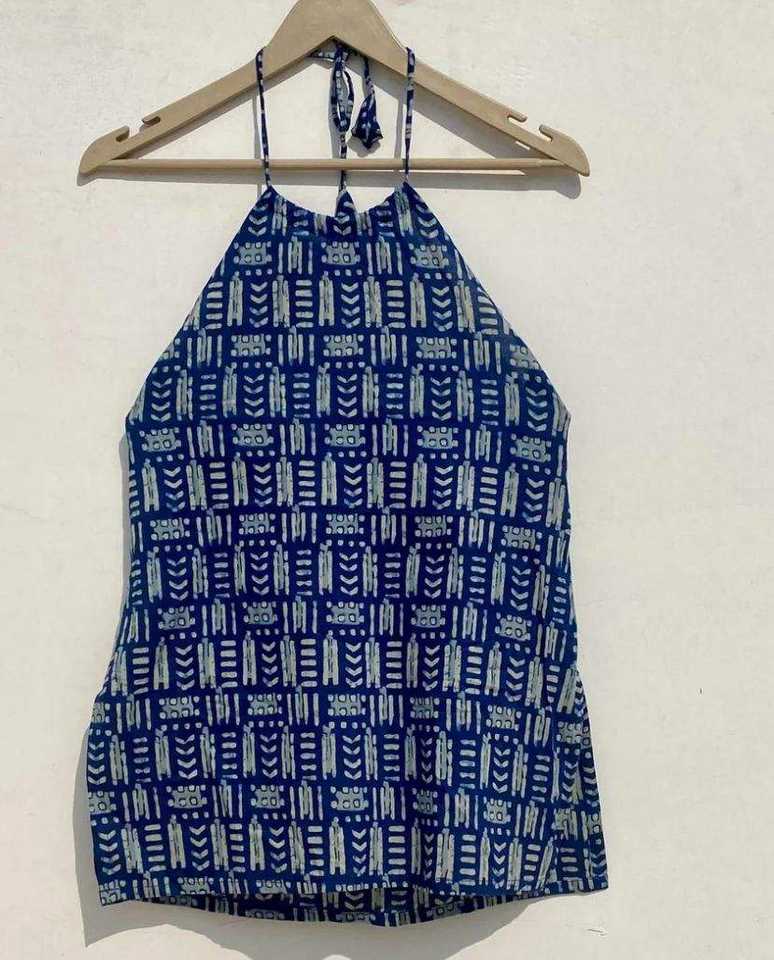 Navy Cotton Top Embroidered Vintage Beach Halter-Neck Top with Tassel Breathable Knitted Fabric and Back Knot Design