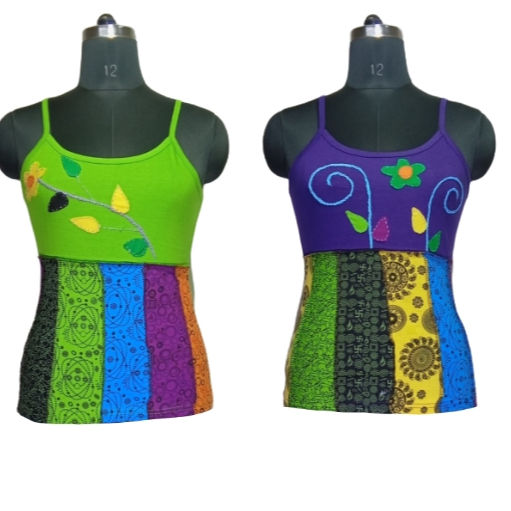 Nepali Boho Blast Print Crop Top for Women Trendy Knitted Rayon Fabric Short Sleeve Tank Hollow Ribbon Decoration O-Neck