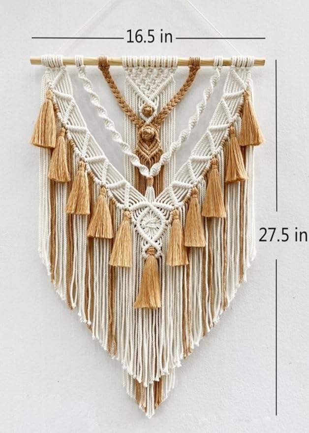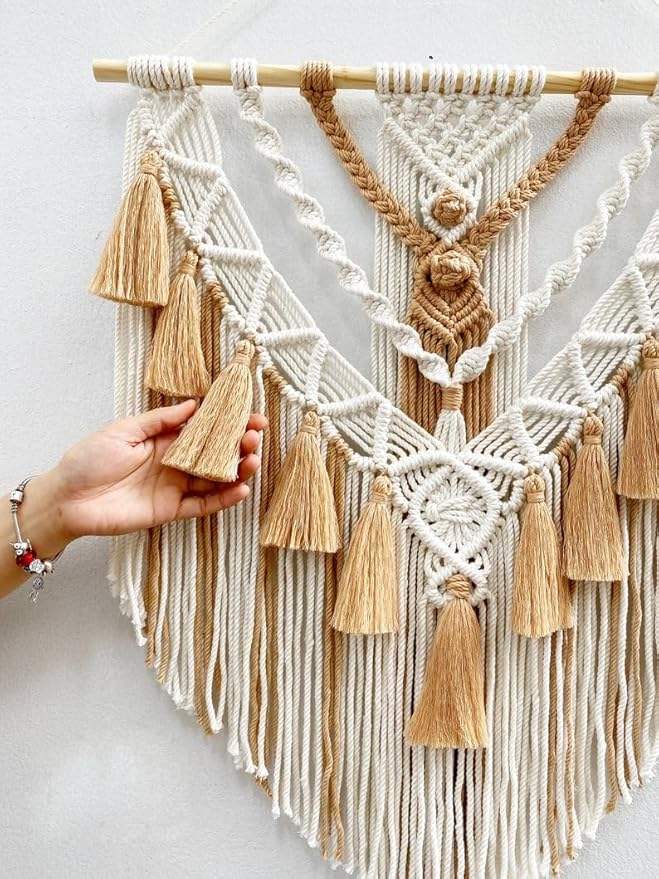 Neutral tone macrame boho wall decor with intricate designs and calming vibe suitable for home yoga or reading rooms