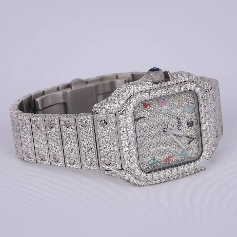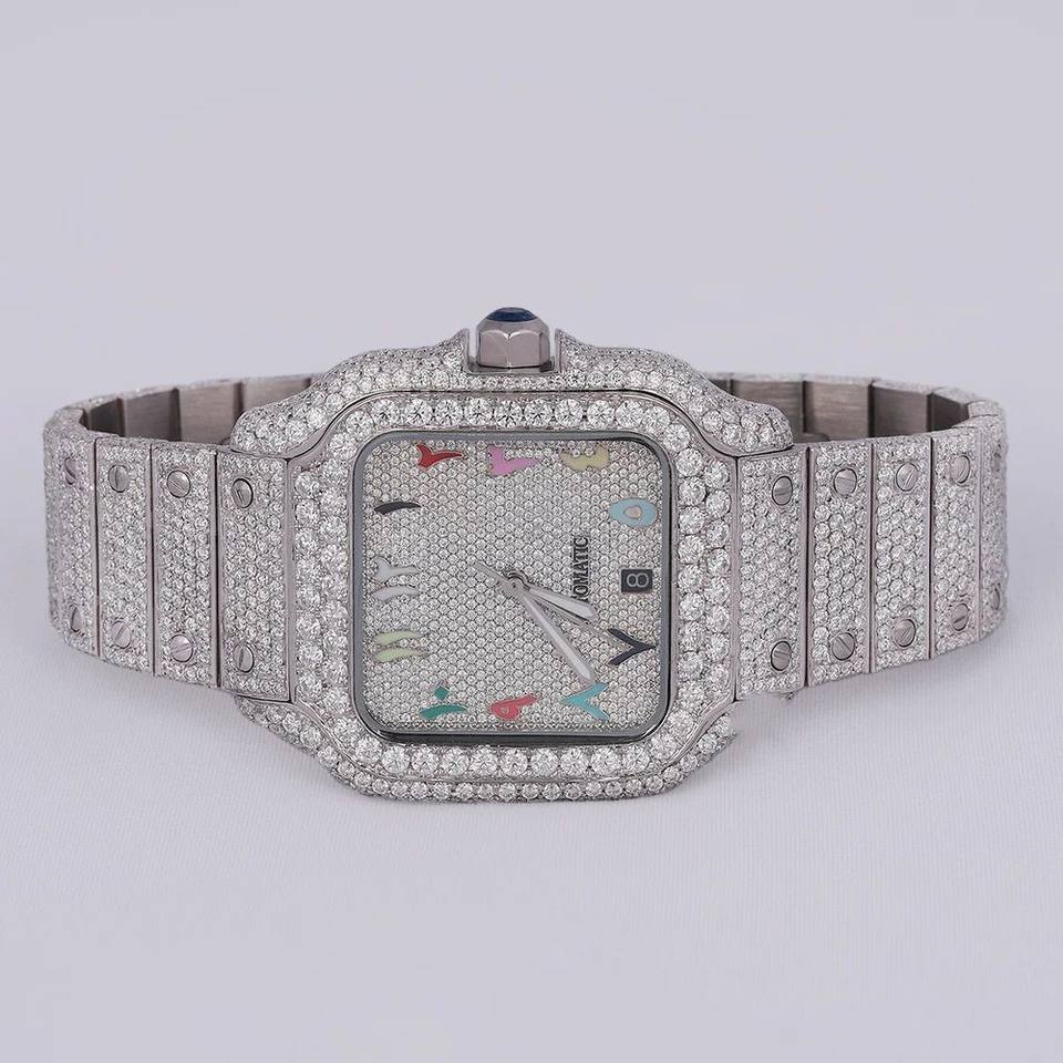 New 18mm Square Stainless Steel Men's Hip Hop Style Mechanical Automatic Watch 14K White Gold Plated VVS Moissanite Diamond