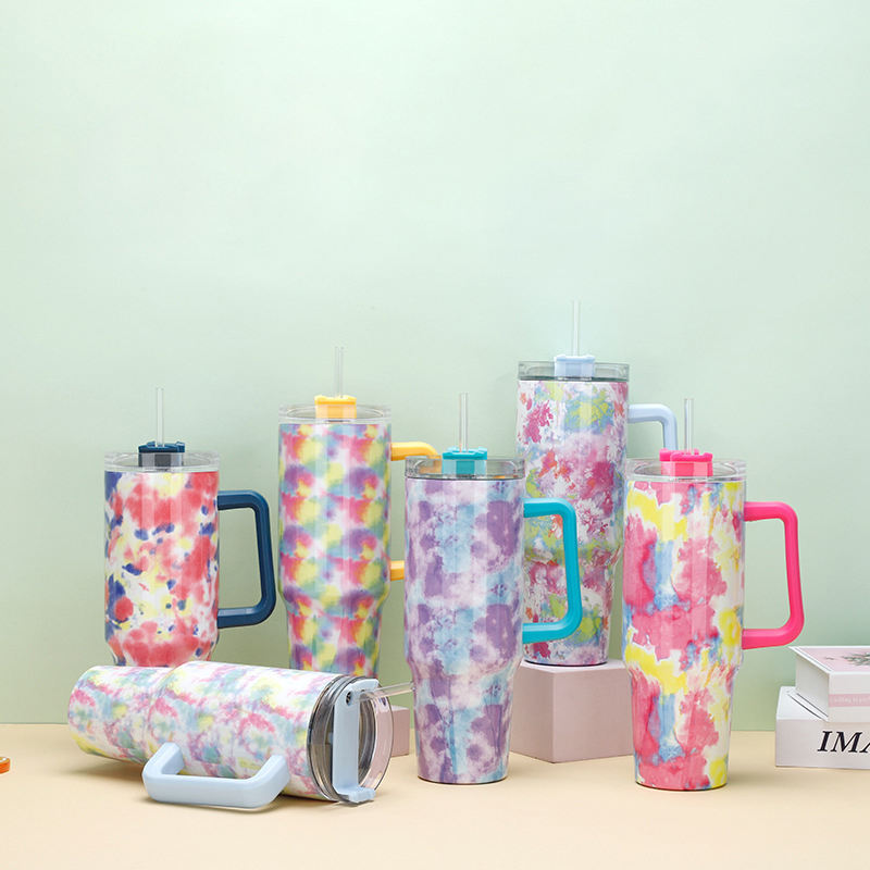 New 2023 Paint Boba 40 oz Mug with Handle Lid and Straw Travel Cup Vacuum Insulated Car Tie Dye Print Tumbler