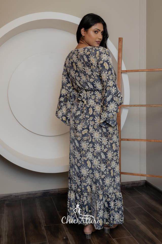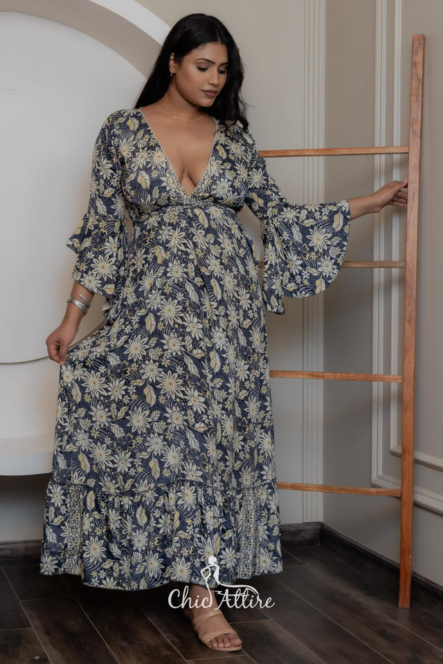New 2024 Latest Floral Printed Bell Sleeve Fit & Flare Maxi Dress Western Party Wear Gown for Women's V-Neckline Summer Dresses