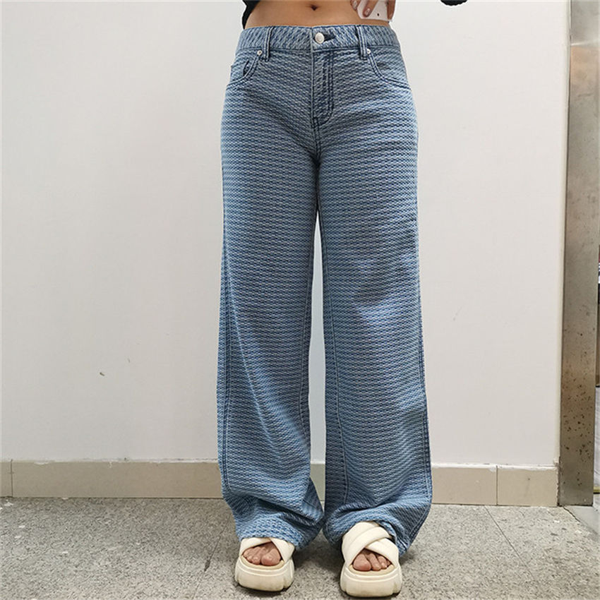 New 2025 Customized OEM Women Denim Jeans Jacquard Trousers for Female Retro Leg Wide Comfort Work Pants Daily Wear