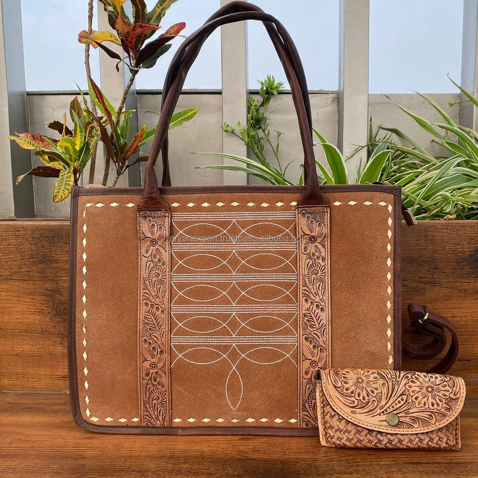 New 2025 Handcrafted Cowhide Suede Leather Tote Bags & Floral Hand Tooled Eyeglass Case Combo Trendy Fashion Accessories Sets
