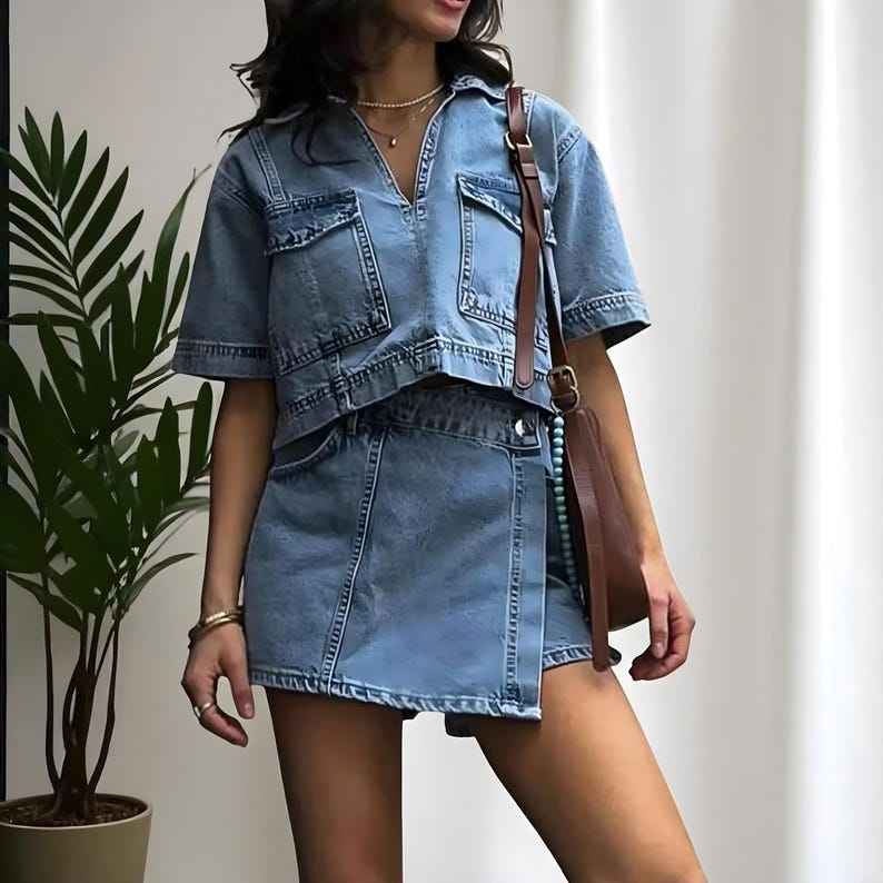 New 2026 Channel Ready to Ship 2 Piece Casual Short Sleeve Boxy Shirt Tops and Shorts Lounge Sets Summer Denim Set for Women