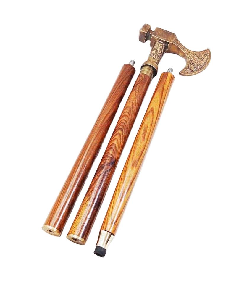 New 3-Fold Black Wood Walking Stick Antiqued Viking Axe Handle with Polished Copper Accents Metal Crafts Cane