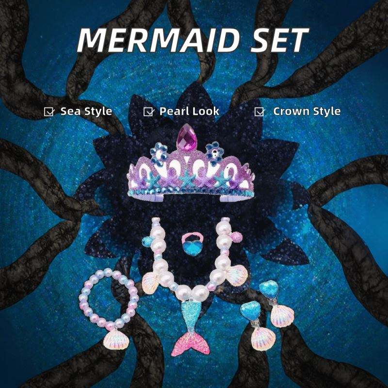 New 6pcs Mermaid Shell Pearl Necklace Bracelet Ring Hair Crown Set for Little Girls Cute Kid's Jewelry