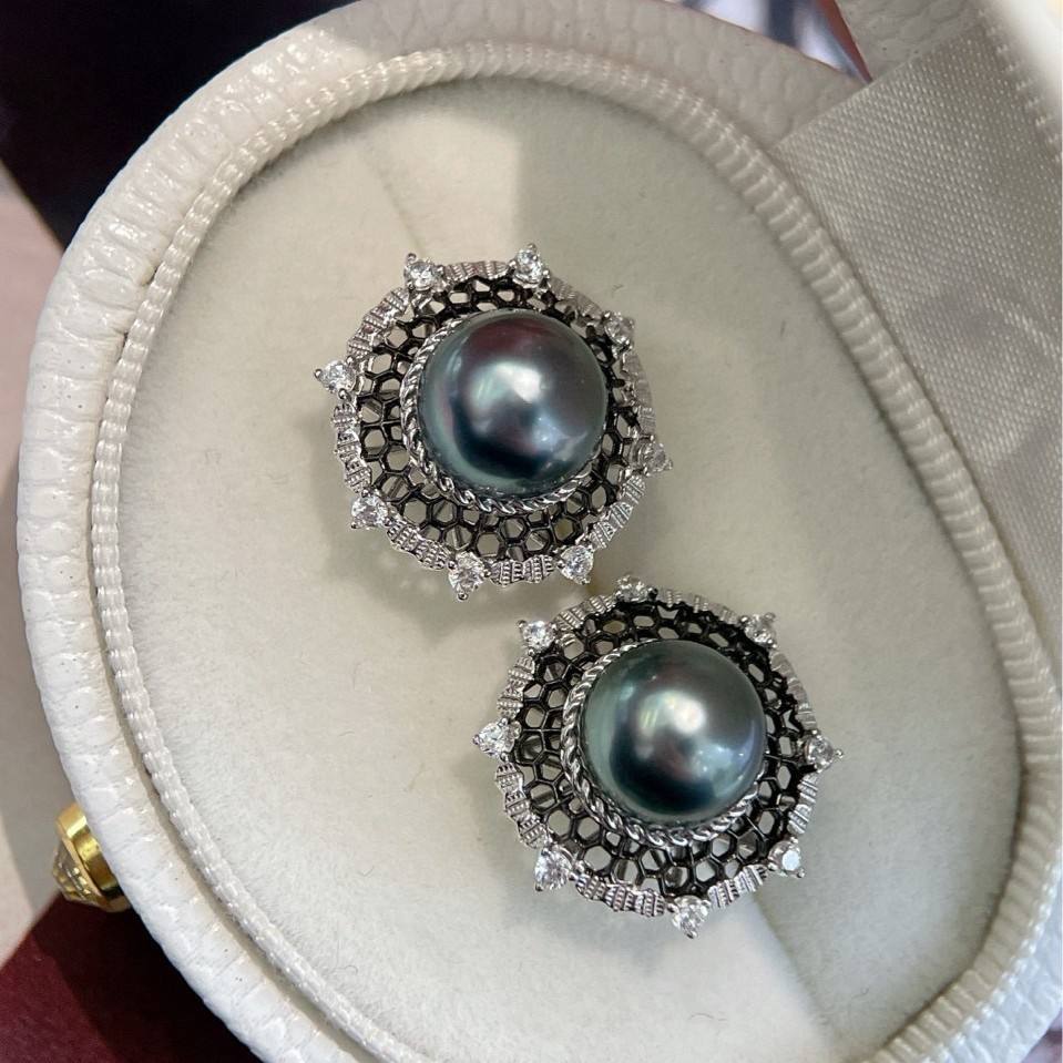 New 925 Sterling Silver Peacock Green Pearl Earrings High Texture Shape 10-9mm Strong Light Slight Flaws