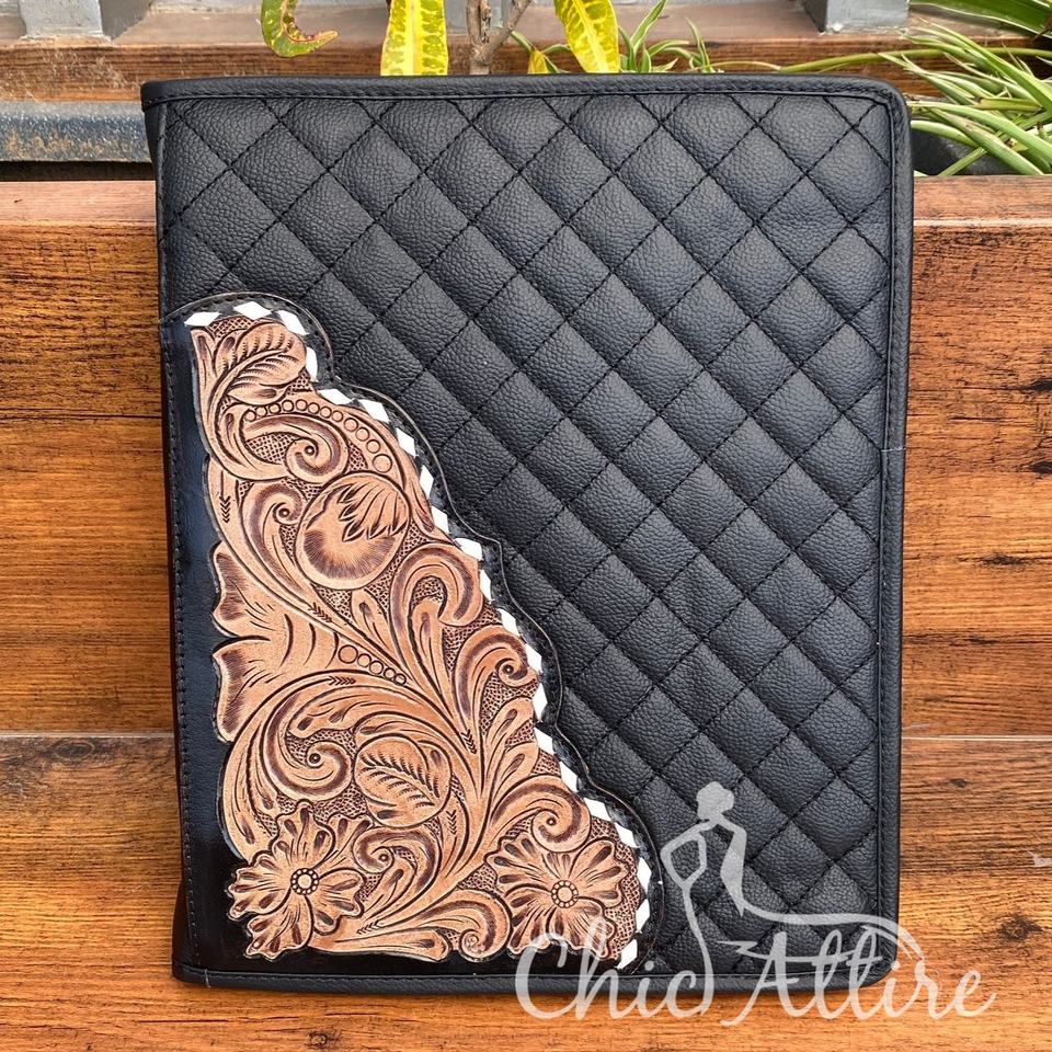 New A4 Size Custom Hand Tooled Leather Interview Resume Padfolio Zipper Ring Binder Genuine Leather Quilted Presentations Folder