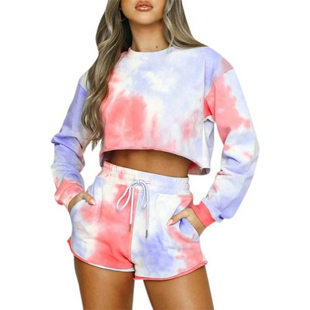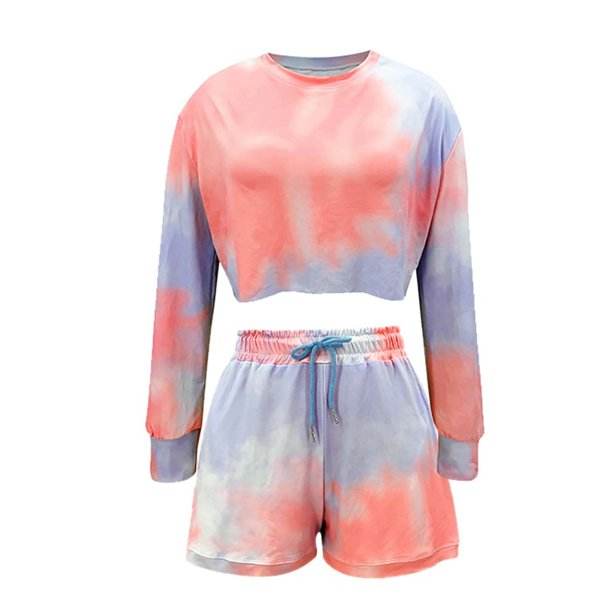 New Arrival 2022 Women Tie Dye Long Sleeve Crop Top Drawstring Shorts Tracksuit Suit 2 Piece Sets