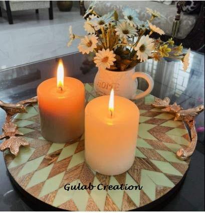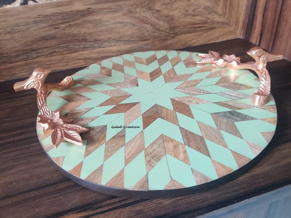 Modern Design Wooden Round Tray with Gold Metal Handles Solid Wood Patchwork Serving Tray for Home & Kitchen Gifting