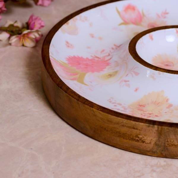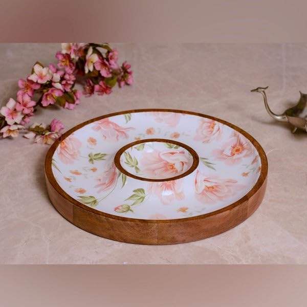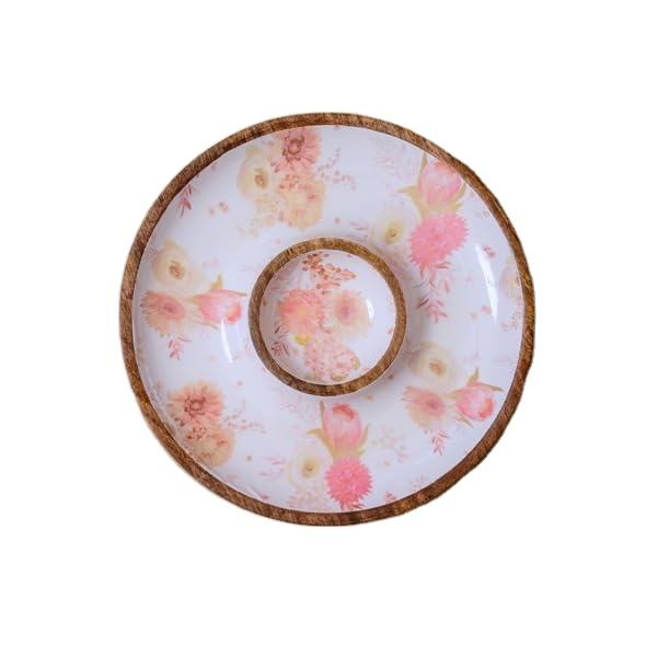 Modern Round Wooden Chip Dip Platter with Floral Print Snack Serving Tray with Central Dip Bowl for Parties & Entertaining