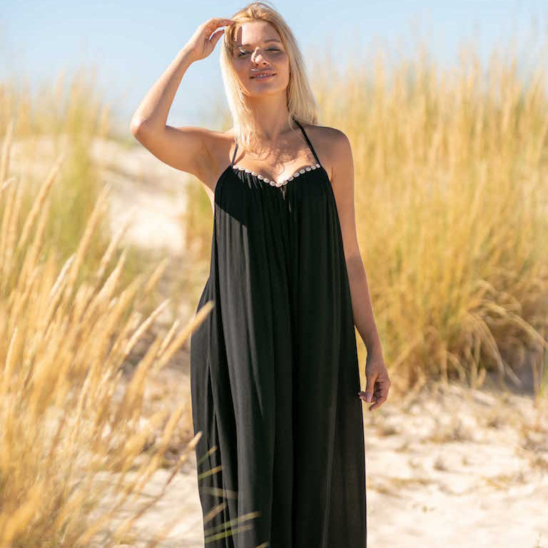 New Arrival Boho Beach Hippie Summer Dress Black Cotton Maxi Dress with Long Sleeveless and Floral Pattern Floor-Length