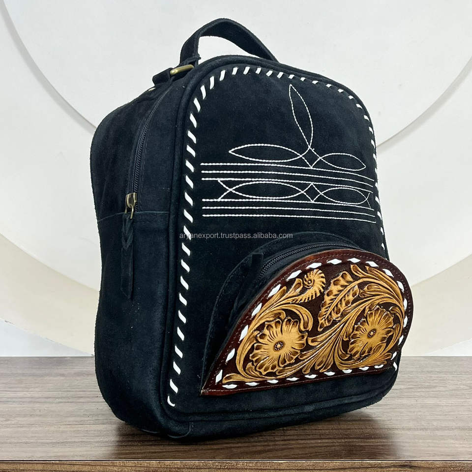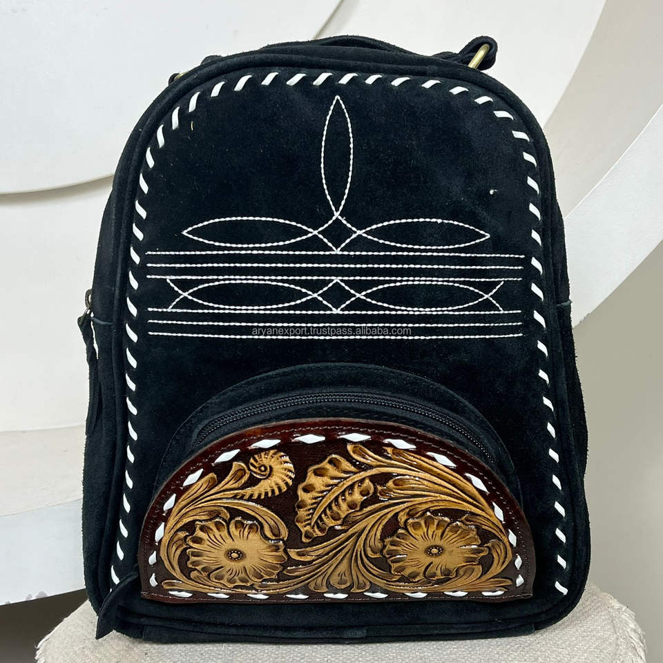 New Arrival Boot Stitch Hand Tooled Black Suede Leather Backpack & Crossbody Bag Western Travel Luxury 2 in One Bag for Women's