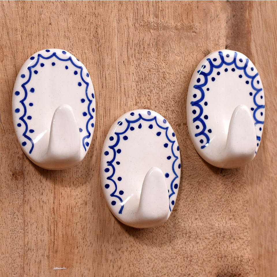 New Arrival Bulk White Adhesive Bathroom Wall Hooks Ceramic Coat Hooks and Hanger Blue Pattern No Drill Wall Hooks HK-2014