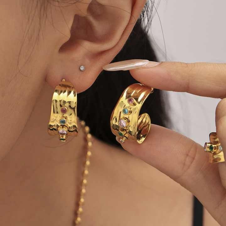 New Arrival Colorful Cubic Stone Crystal Wide Band Women Ring Earrings Stainless Steel Waterproof 18K Gold Plated Jewellery Set