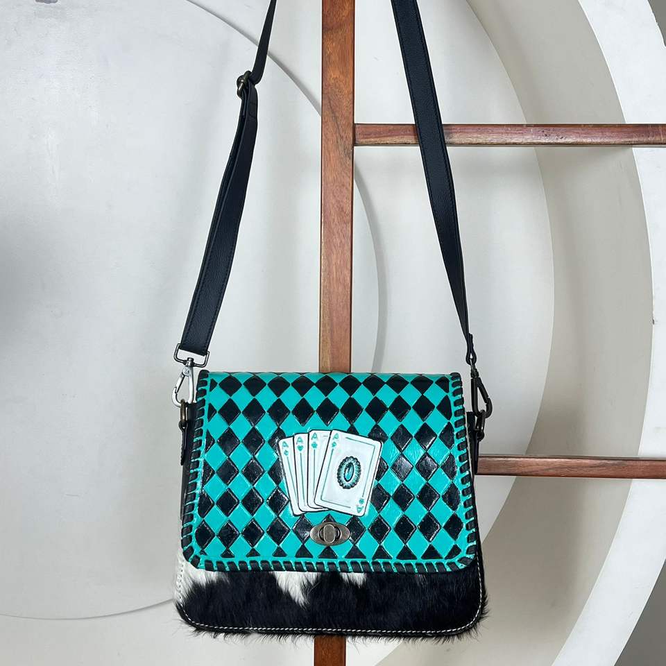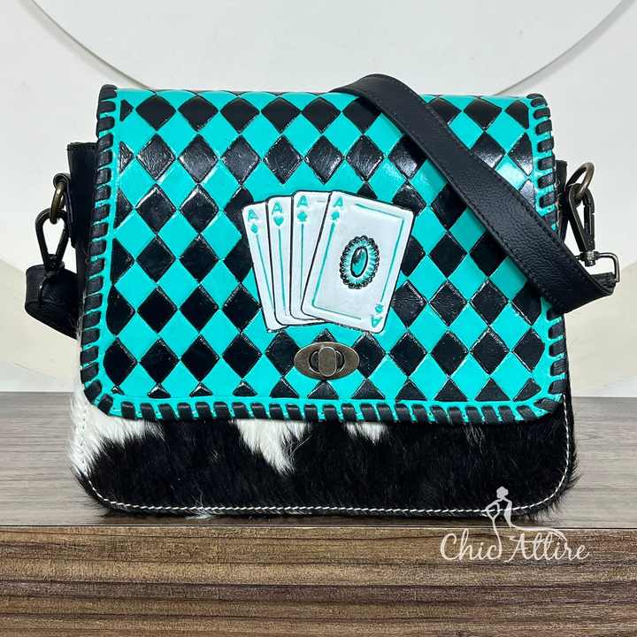 New Arrival Cowgirl Style Handmade Tooled Cowhide Leather Checkered Pattern with Playing Card Crossbody & Shoulder Women Purses