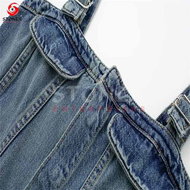 New Arrival Denim Long Denim Jumpsuit With Sleeveless Straight Cut Leg and Square Pockets on the Front
