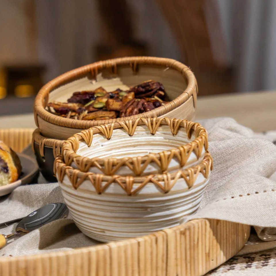 Round Spun Bamboo Mini Pinch Bowls with Rattan