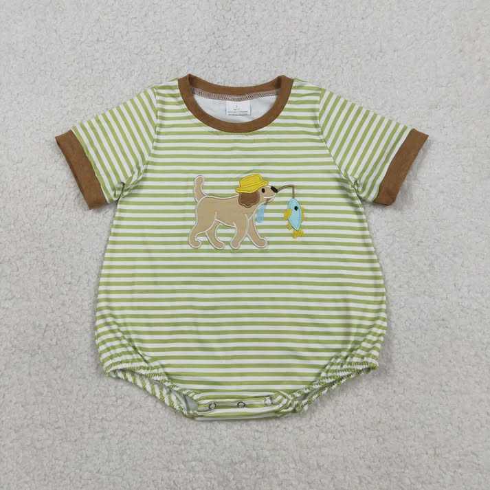 New Arrival Embroidered Fishing Puppy Green Striped Baby Jumpsuit Matching Baby Boy Clothes