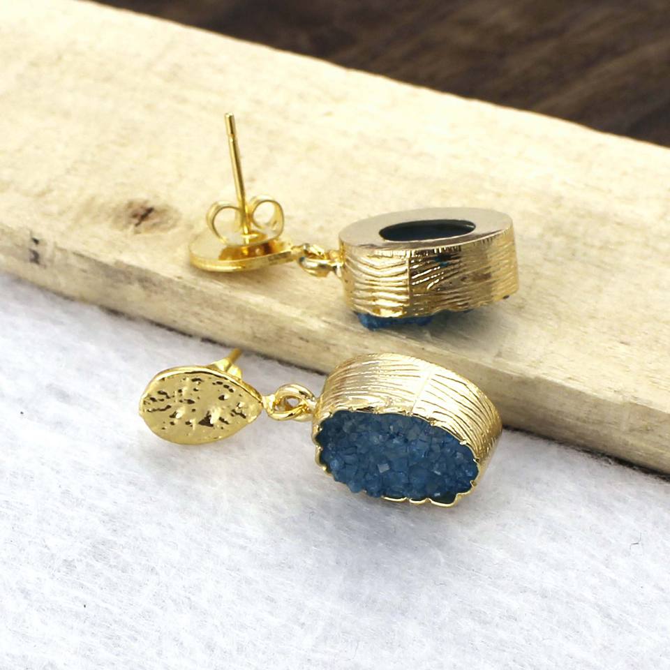 New Arrival Exquisite Handmade Blue Sugar Druzy Stud Earrings Gold Filled Oval Natural Blue Jewelry Fashionable Stud Earrings