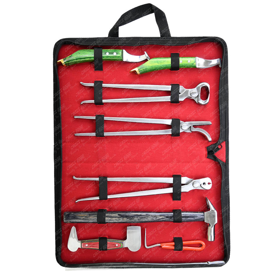 New Arrival Farrier Tools Kit Hoof Clincher, 12" Nipper, Horseshoe Nail Puller & Sharpe Hoof Knife Large Loop with Brass End