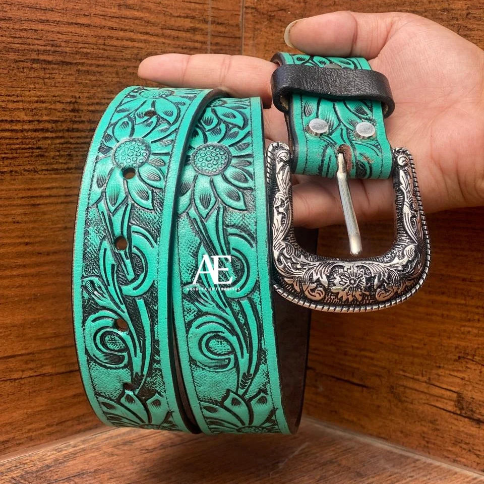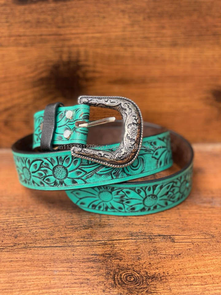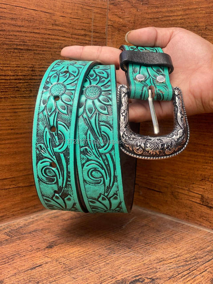 New Arrival Genuine Leather Western Hand Tooled Turquoise Painted Floral Belts Real Handmade Tooled Leather Unisex Waist Belts