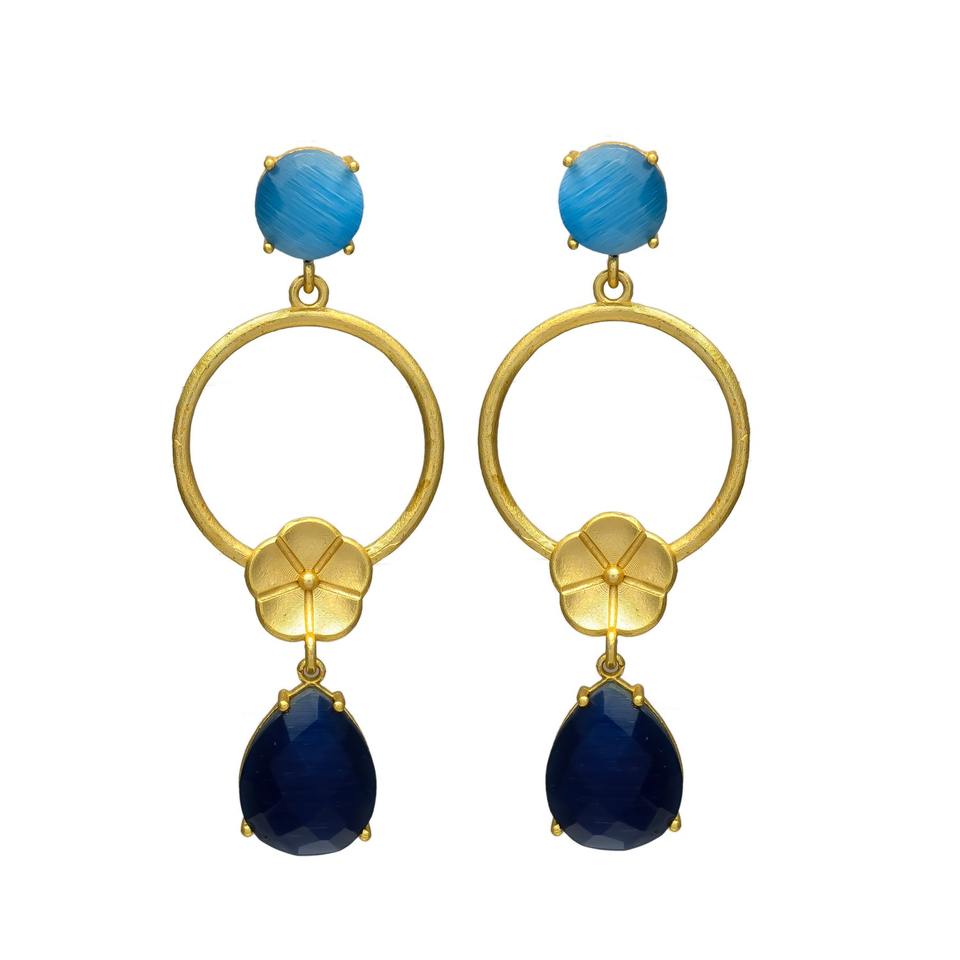 New Arrival Gold Tone Circular Drop Earrings with Flower and Sapphire Hydro and Blue Quartz Gemstone
