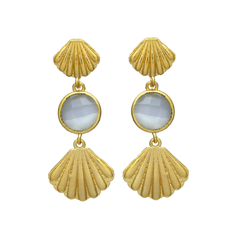 New Arrival Gold Tone Designer Dangle Earrings With Seashell Design Grey Monalisa Gemstone Brass Earrings For Everyone Earring