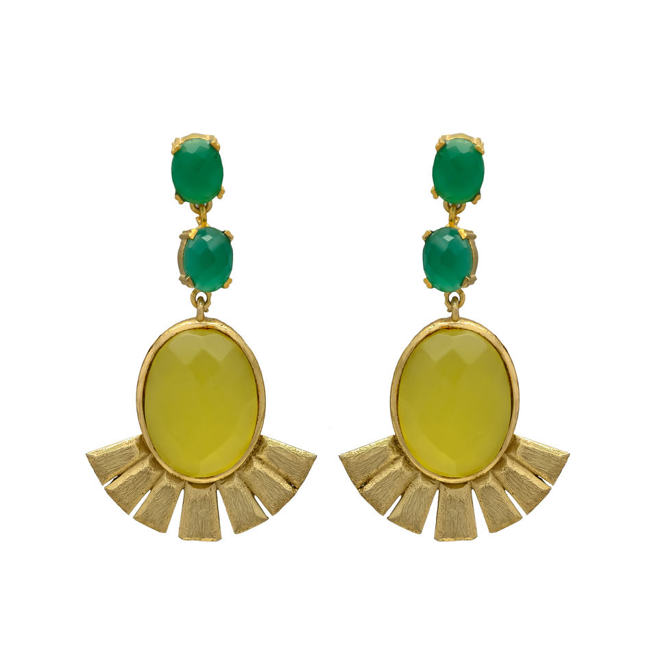 New Arrival Gold Tone Designer Dangle Earrings With Unique Design Green Onyx And Yellow Monalisa Gemstone Brass Earrings